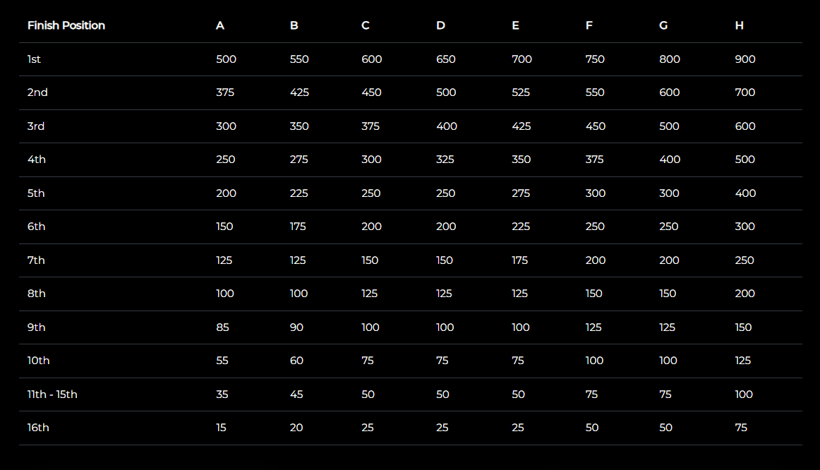 For specialized events like Heads Up, where, for example, 4 players are eliminated from the last 8, points are averaged based on the total of 5th to 8th place points.