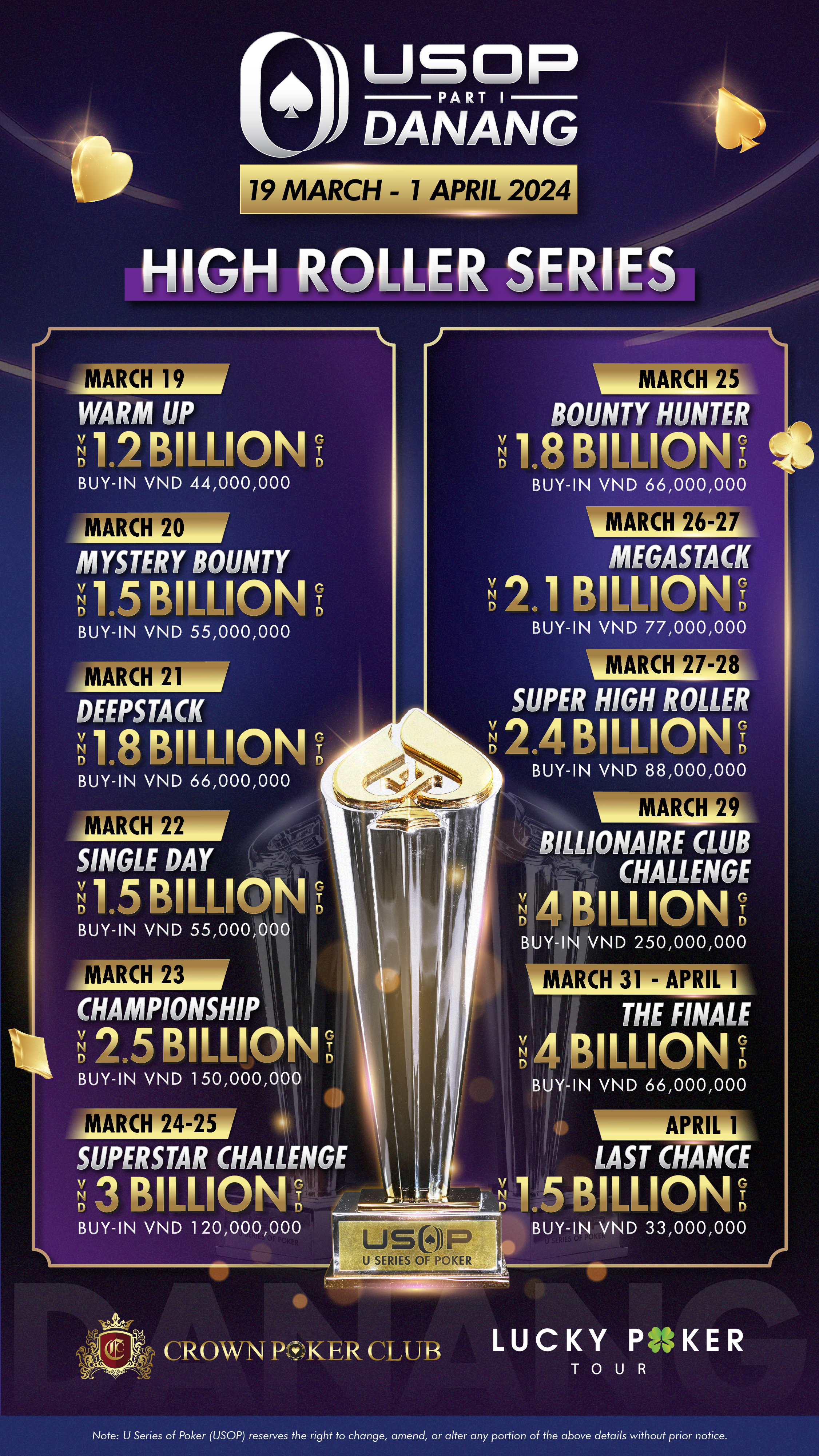 Prepare for an unforgettable poker experience at USOP Da Nang 2024 Part 1, where a plethora of 71 events awaits players of all skill levels. The pinnacle of excitement lies in the VND 15 Billion GTD Main Event, featuring four starting flights and a VND 30 Million buy-in.