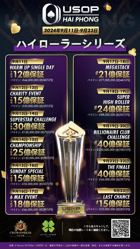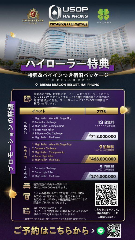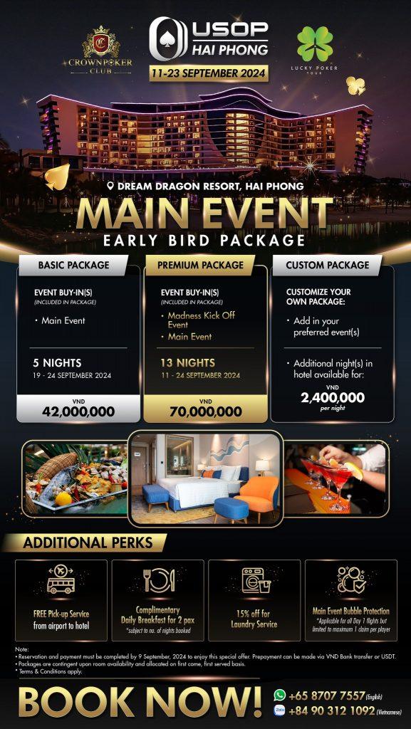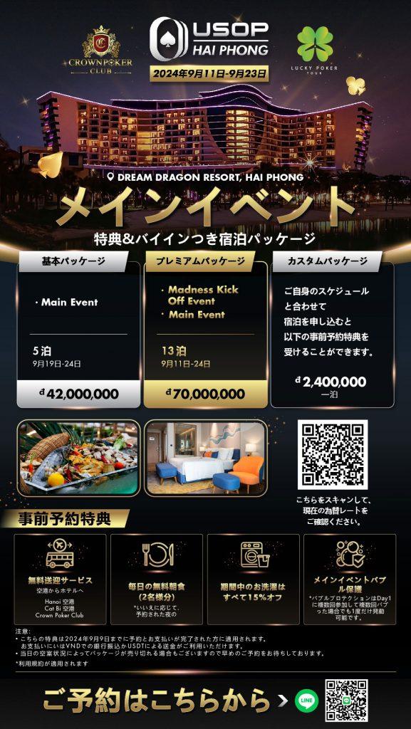 USOP Hai Phong 2024 LOCATION Dream Dragon Resort, Vietnam DATE Sept 11 -23 , 2024 GTD PRIZE POOL 60 Billion VND EN CN JP EVENT SCHEDULE (EN) SATELLITE SCHEDULE (EN) PLAYER GUIDE (EN) EVENT SCHEDULE (CN) SATELLITE SCHEDULE (CN) PLAYER GUIDE (CN) EVENT SCHEDULE (JP)🇯🇵 SATELLITE SCHEDULE (JP)🇯🇵 PLAYER GUIDE (JP)🇯🇵 SCHEDULE PROMOTIONS Japanese [Hai_Phong_Schedule] DEADLINE: Sep 09, 2024 Main Event Early Bird Package CONTACT US FOR MORE INFO DEADLINE: Sep 09, 2024 High Roller Early Bird Package CONTACT US FOR MORE INFO Ready to Dive into the Action? Name Email Phone Check-In Date Check-Out Date Message Submit