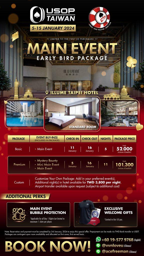 Jan 14, 2024 (Sunday) | Time | # | Event | Buy-In + Fee (TWD) | Starting Stack | Guarantee (TWD) |